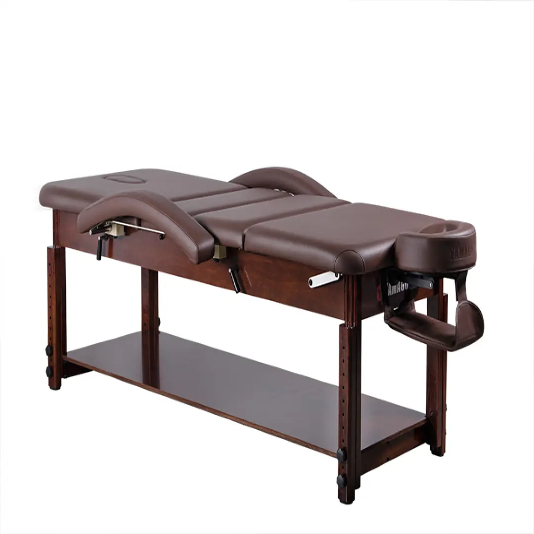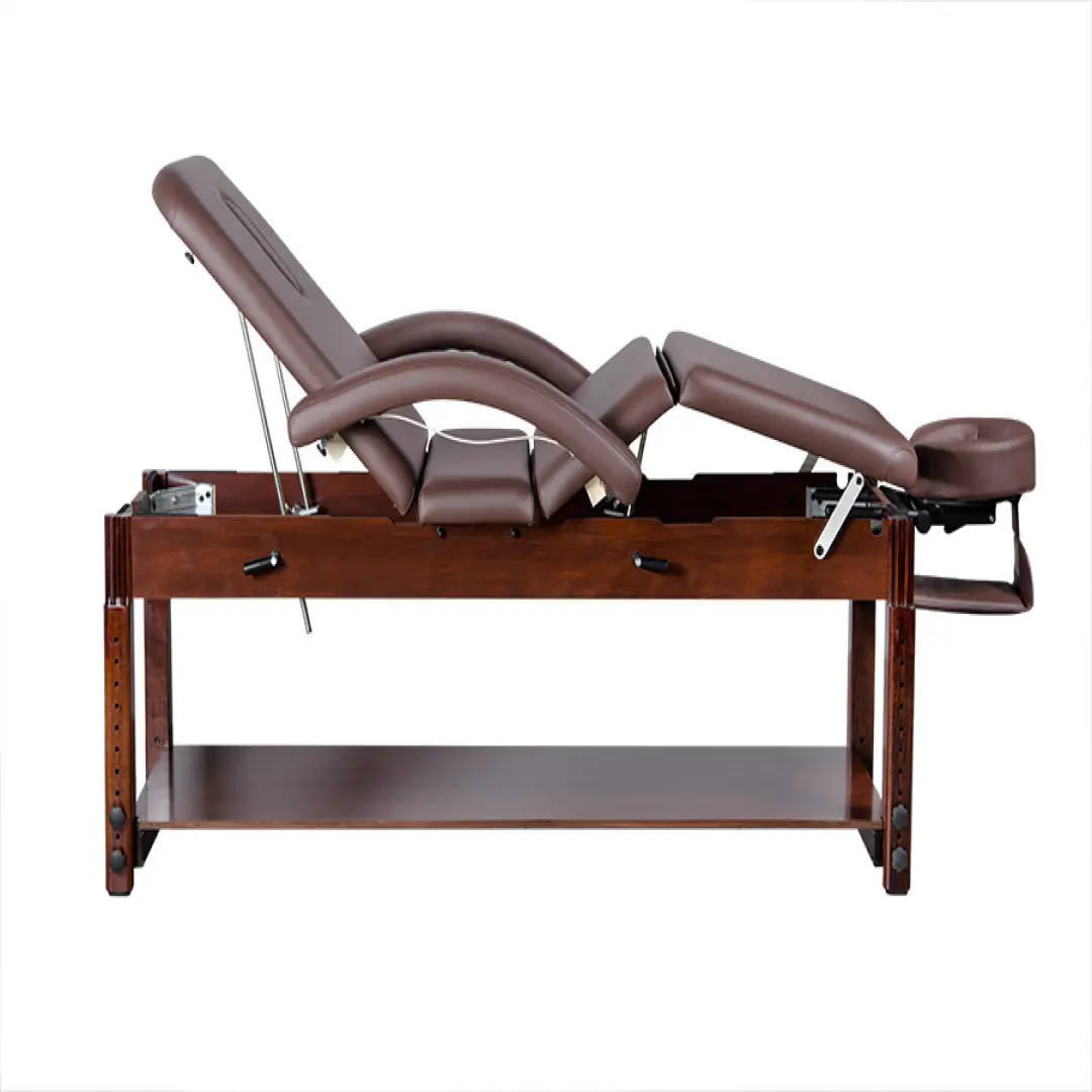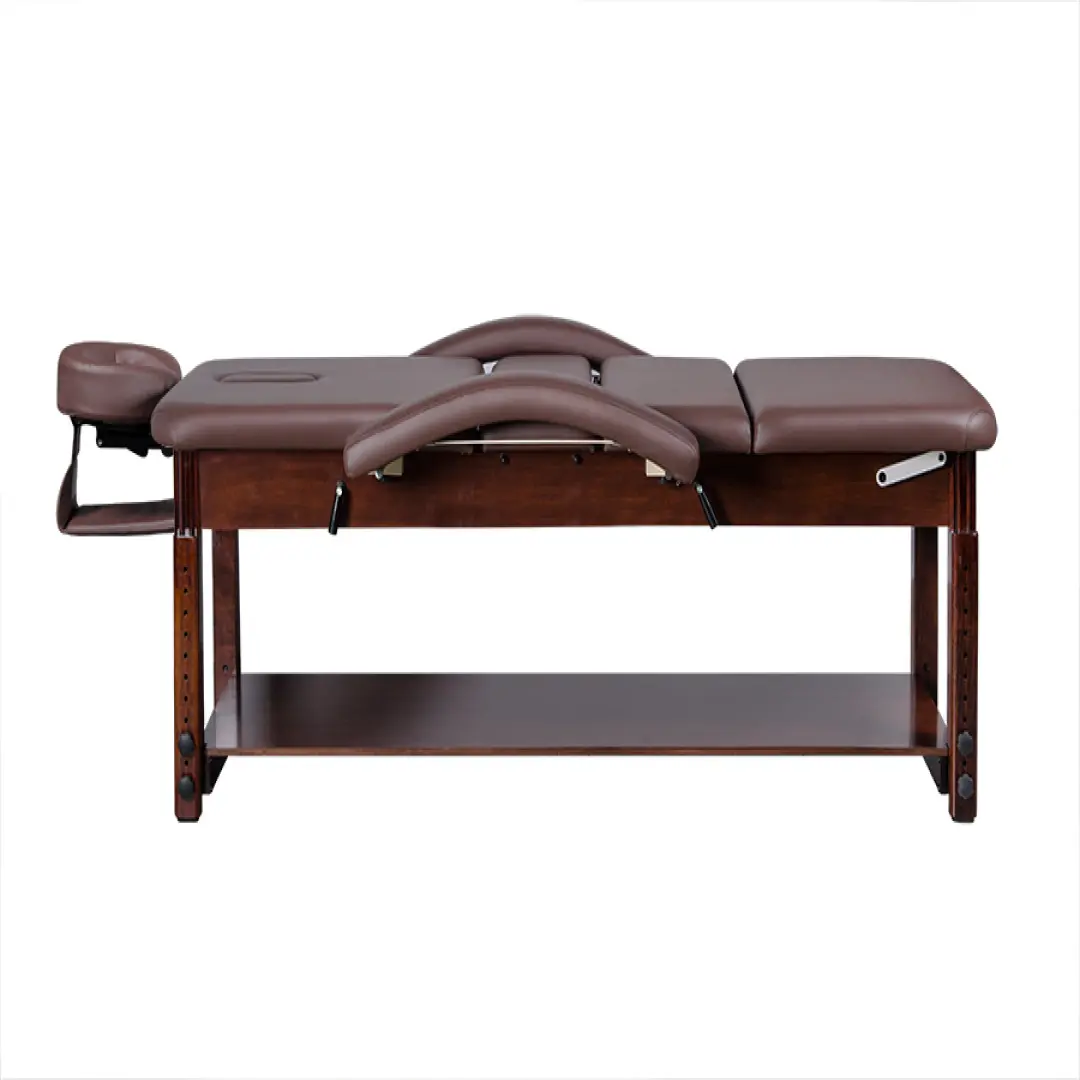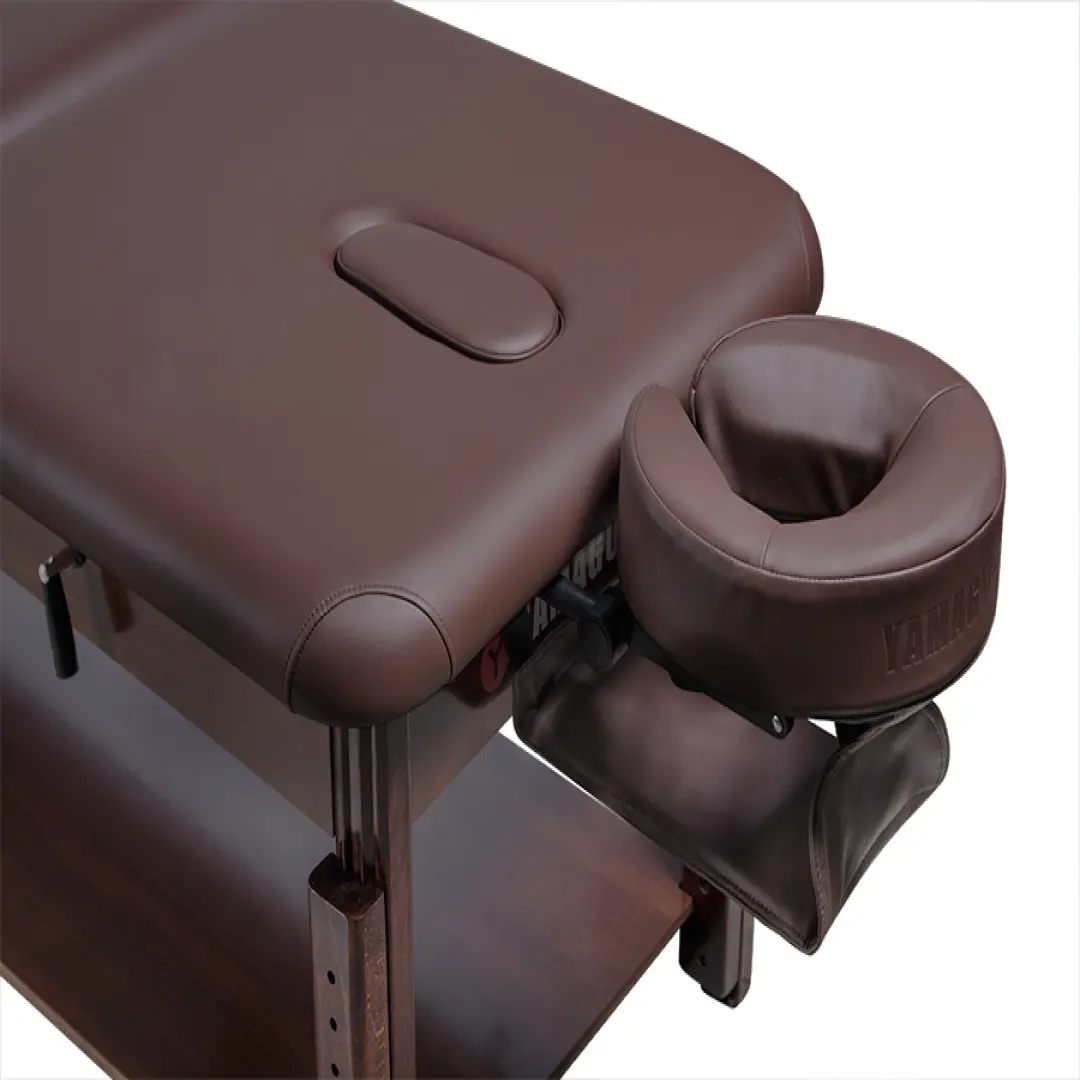 Его конструкция сейчас является более продуманной до мелких элементов, что способствует наличию еще большей прочности, функциональности и долговечности. Благодаря каркасу, который был произведен из экологически чистого бука, и наличию благородного шоколадного цвета, стол в любом массажном кабинете будет занимать основную позицию.