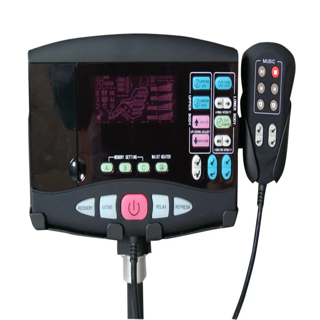 - Пульт управления массажем оснащен современным VFD-дисплеем, где на схеме человека отображается текущее массажное воздействие.